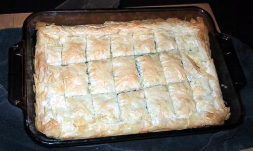Now here's the frustrating part: take a sheet of fillo and lay it in a lightly oiled 9x13 pan. Yes, I know it's like all sticking together and stuff, just slowly peel it apart. Ok, now brush it lightly all over with margarine. Look, it's gonna tear, ok? You just have to deal with it. There's no need to cry, your dinner party isn't ruined. Just take a deep breath and put in seven more layers, brushing each. Was that so hard? Now put in the filling, spreading it all the way to the edges. You're half-way done! Eight more layers, margarine on the top, roll the edges down, you are now a fillo dough pro. Take a sharp knife and cut into squares. Don't cut all the way through the bottom layer though.