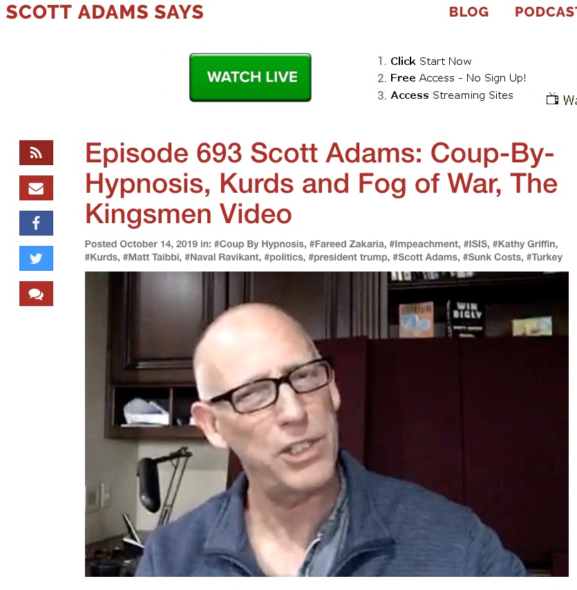 <https://www.scottadamssays.com/2019/10/14/episode-693-scott-adams-coup-by-hypnosis-kurds-and-fog-of-war-the-kingsmen-video/>